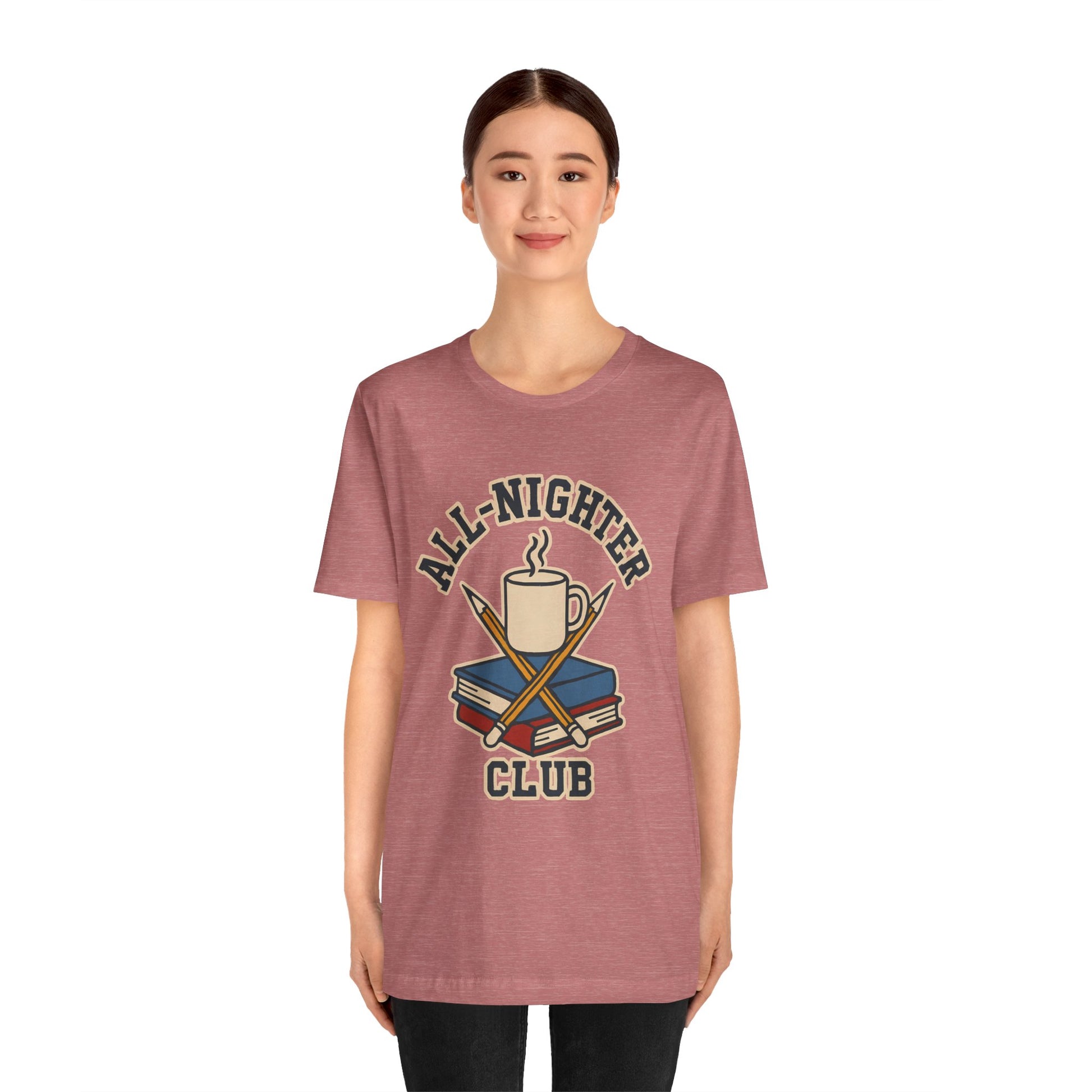 Welcome to the All-Nighter Club, where the lights are always on, the pencils are always dull, and sleep is a myth. Whether you're burning the midnight oil before exams or cramming in your favorite booth at study hall, this shirt honors the sacred tradition of running on caffeine, panic, and the occasional flash of brilliance.