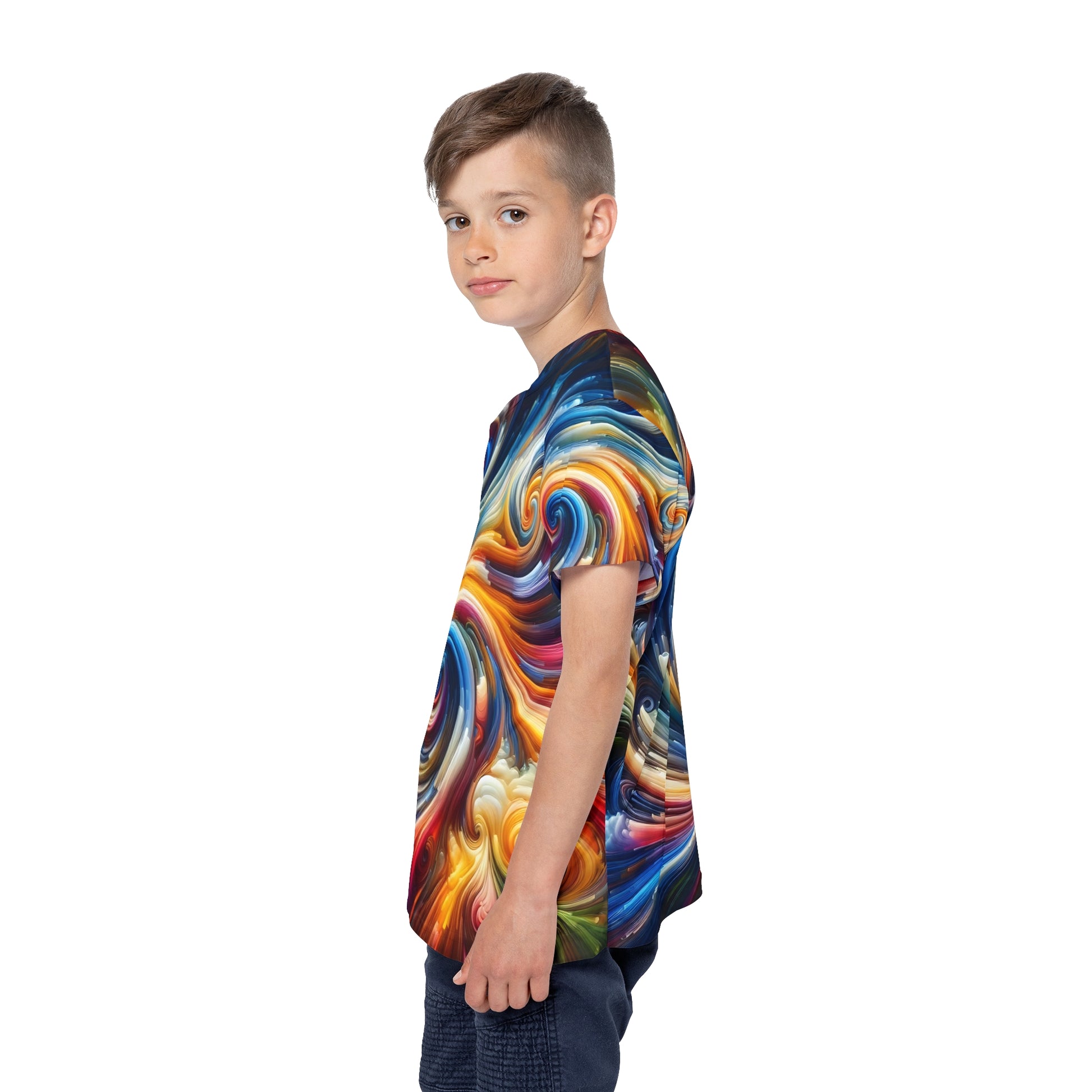 This tee also makes a standout gift for creative children, mini artists, color lovers, and kids who enjoy wearing pieces that spark conversation. If your child loves bright designs, swirling patterns, or anything that feels a little like magic, this all-over print tee will quickly become their go-to shirt for expressing their personality in full color.