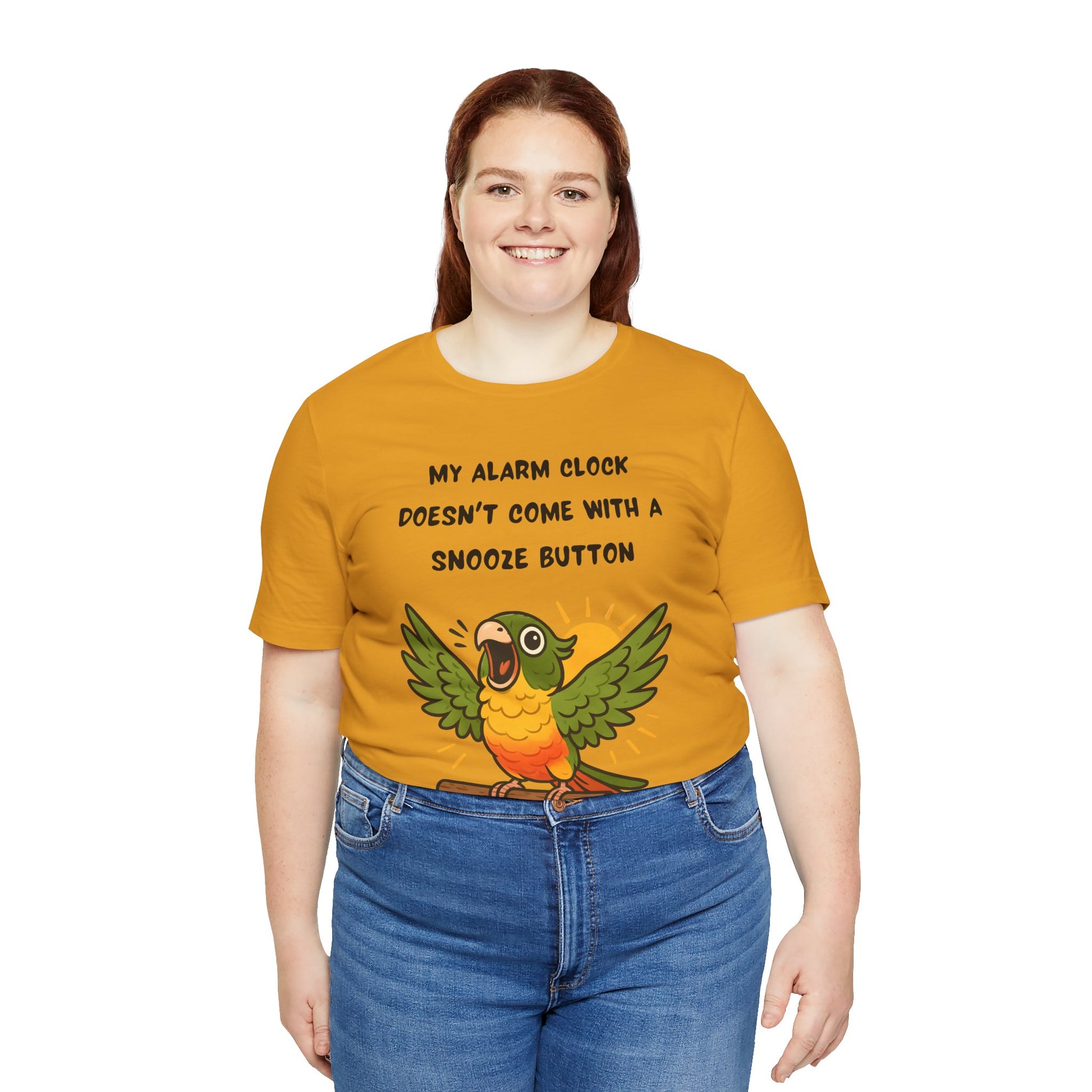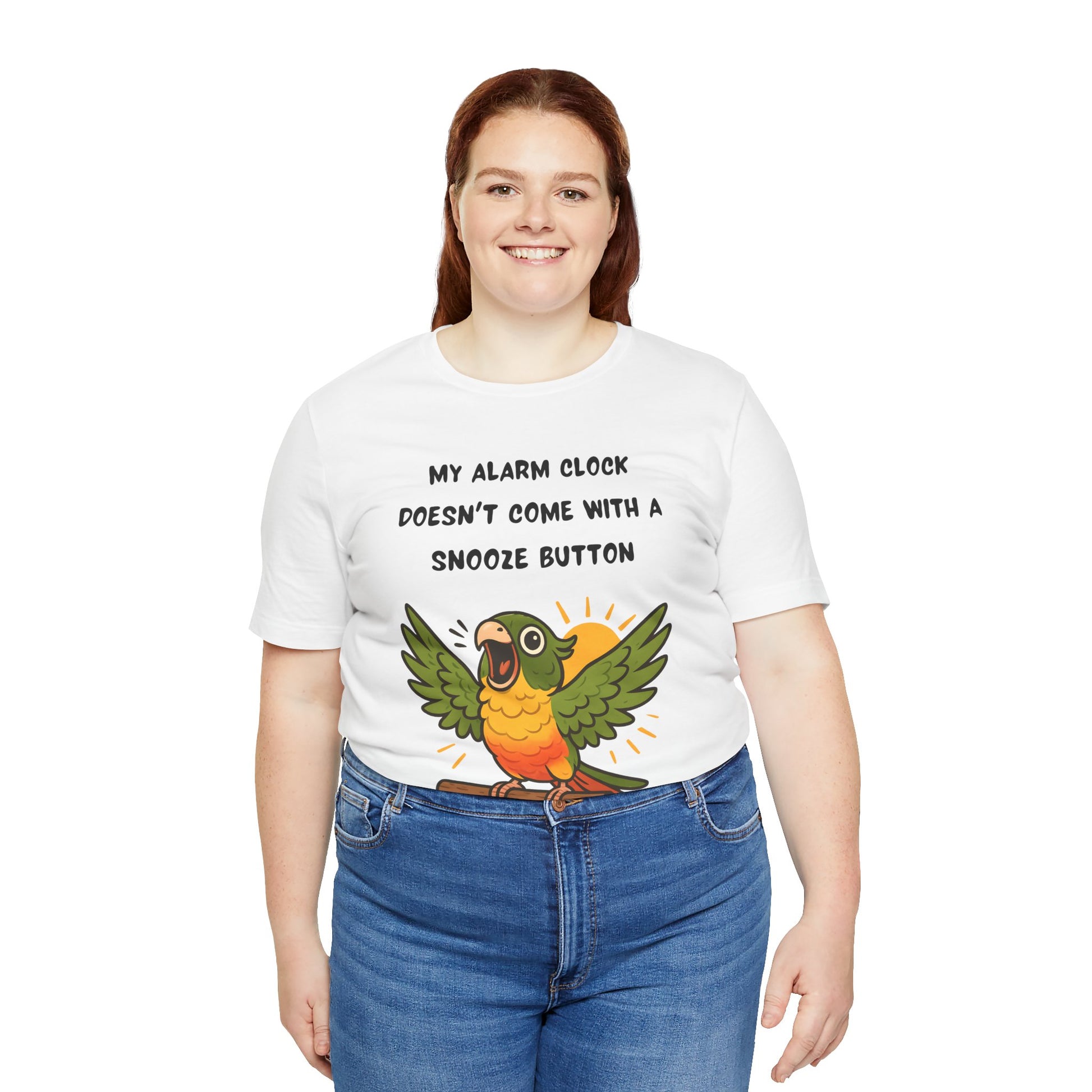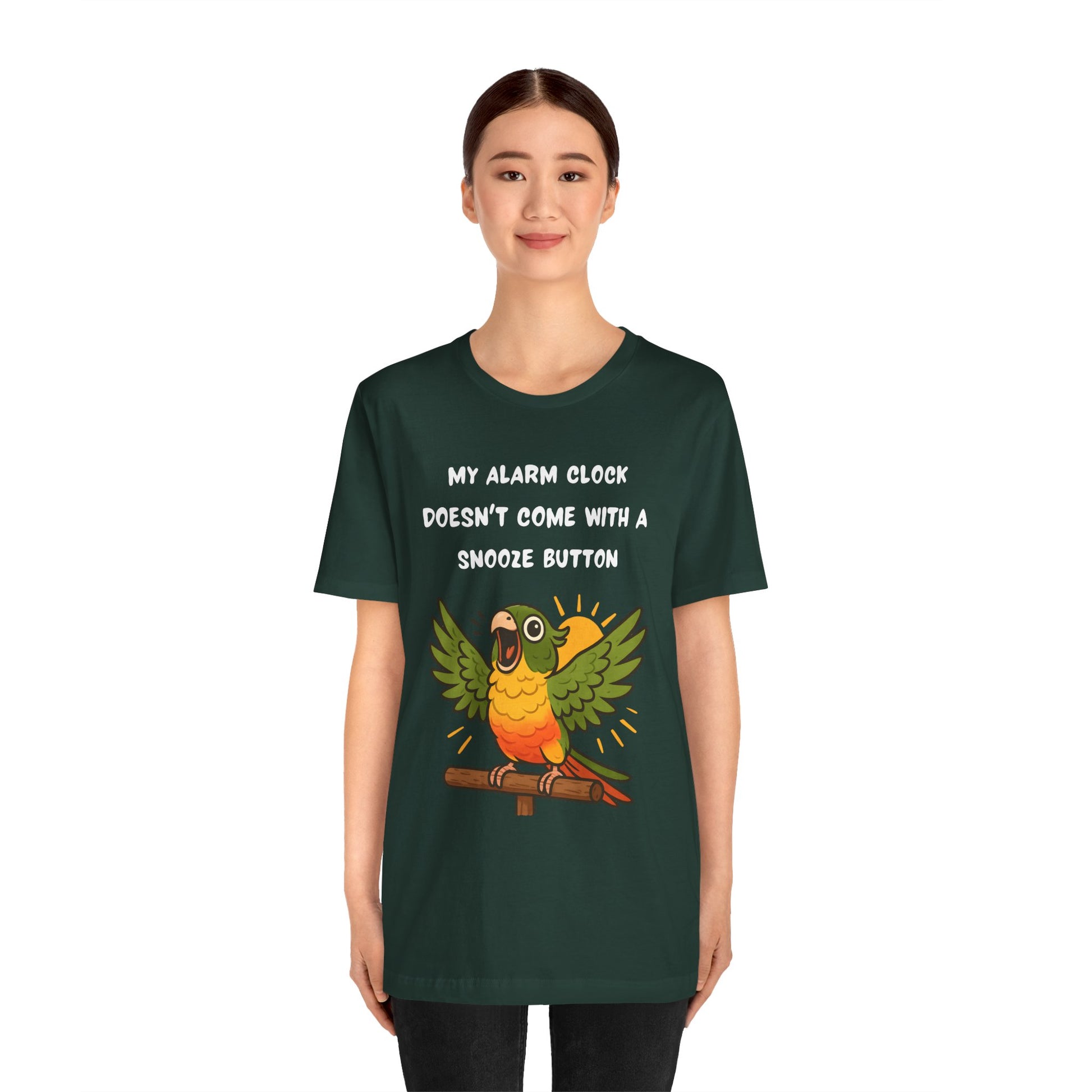 Parrot Alarm T-Shirt – Funny Green Cheek Conure Wake-Up Call Tee