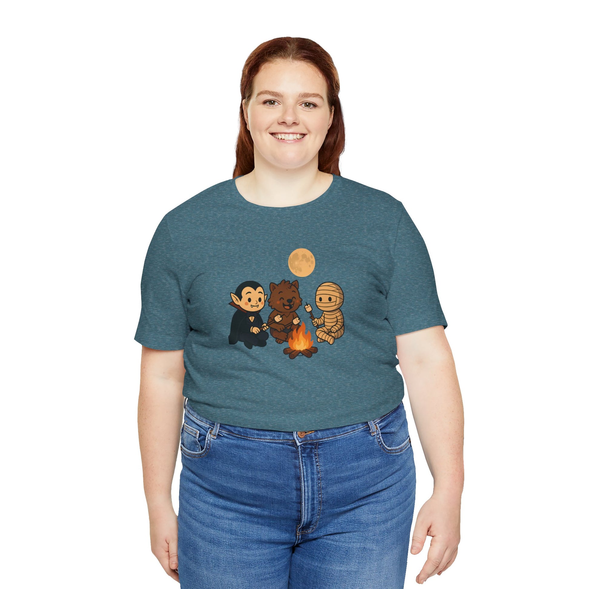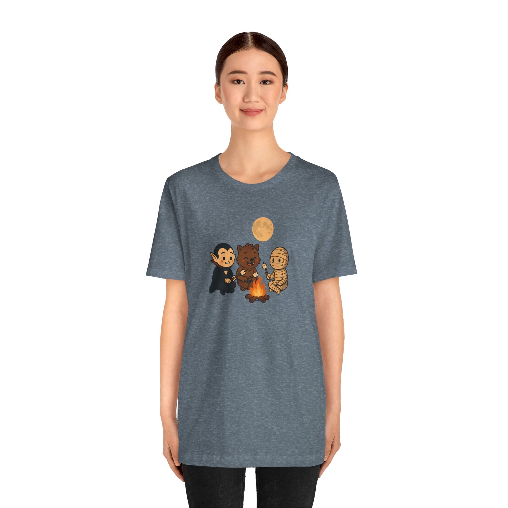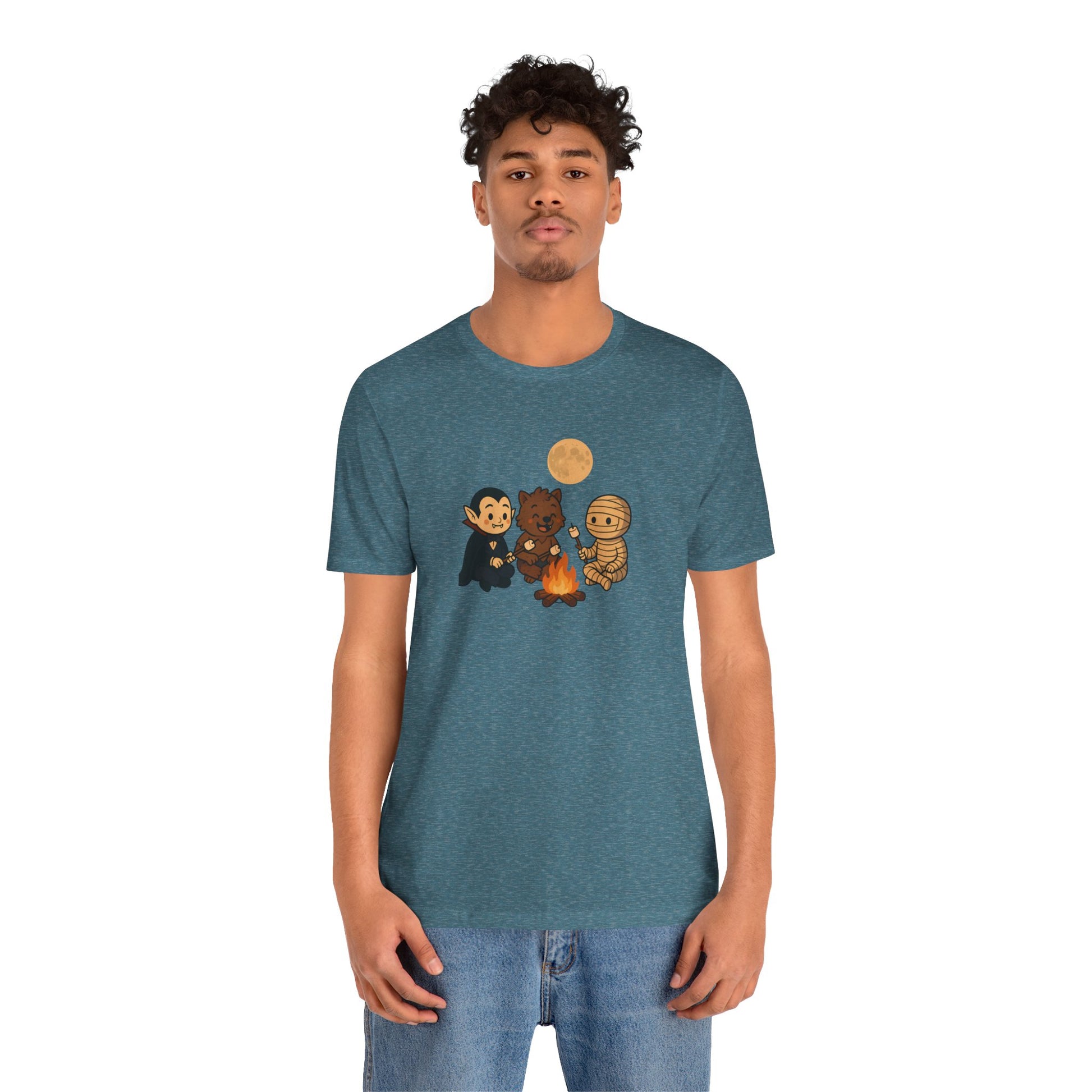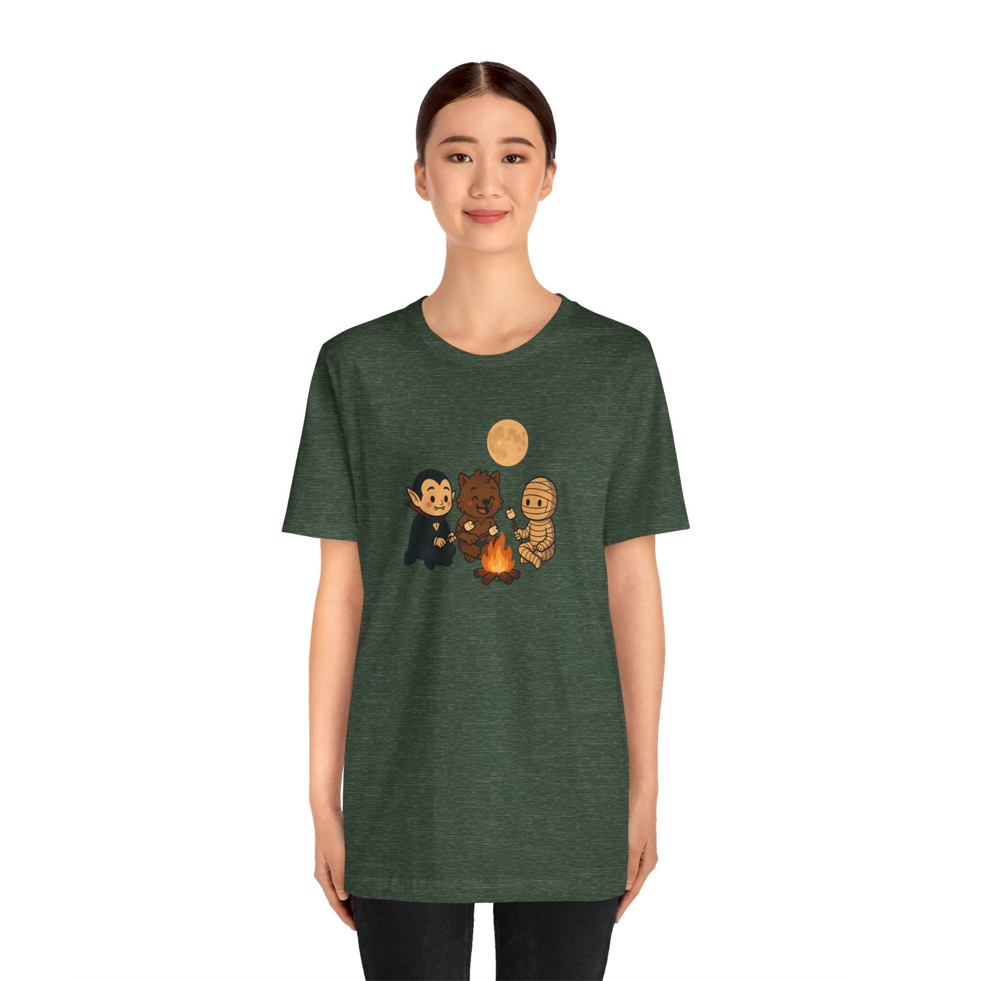 Spooky season just got sweeter. The Halloween Monsters Campfire T-Shirt brings a whimsical twist to classic horror with a charming design of a vampire, werewolf, and mummy gathered around a glowing campfire. Instead of scaring villagers, these monsters are roasting marshmallows under a full moon — because even creatures of the night deserve a cozy night out.