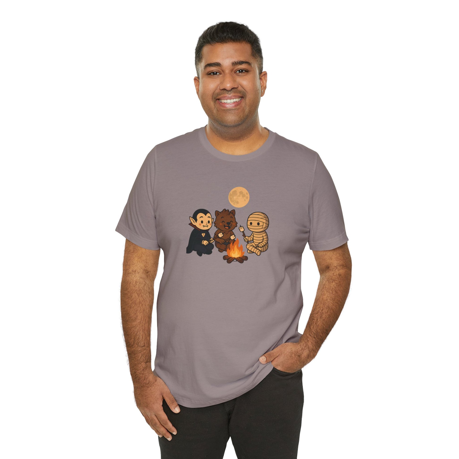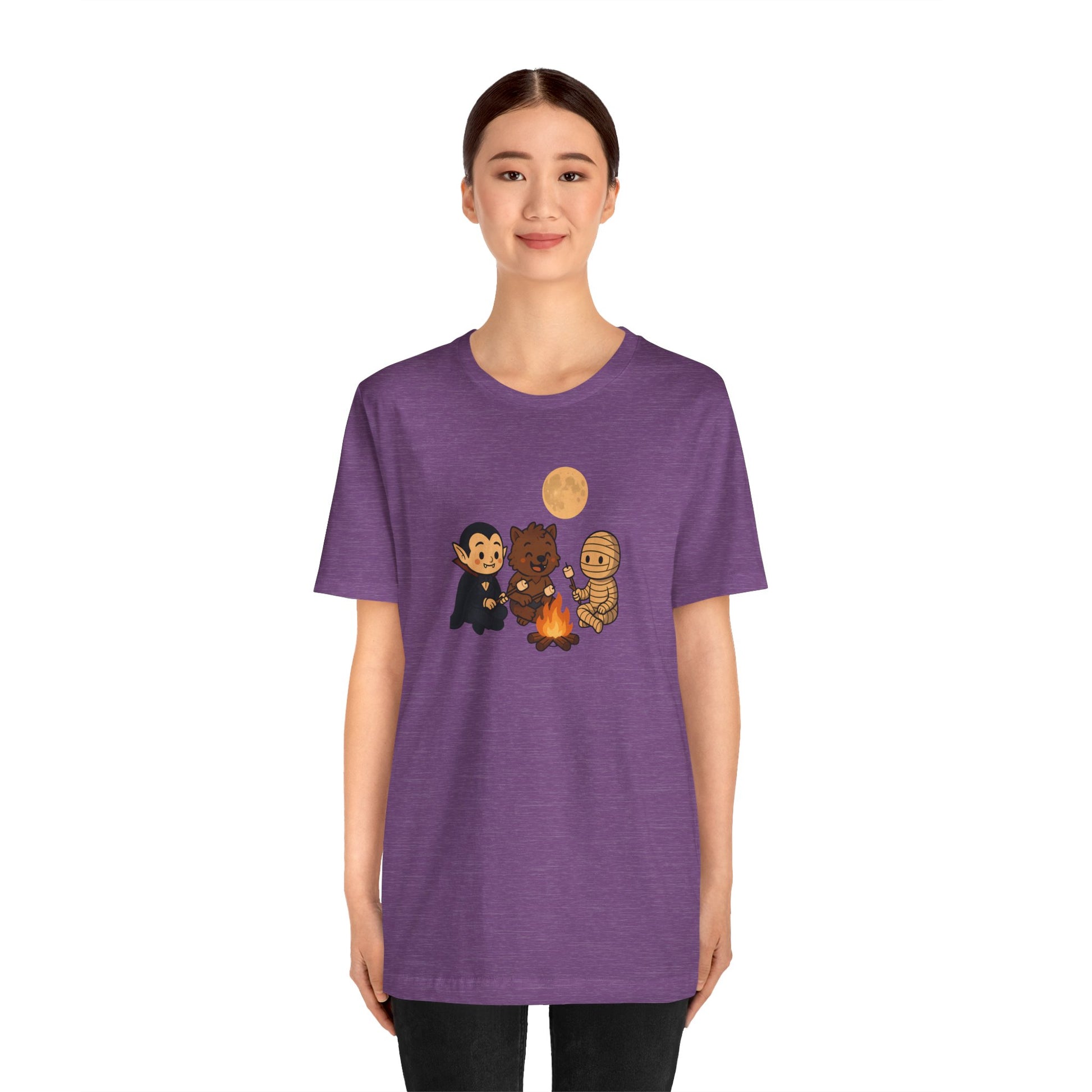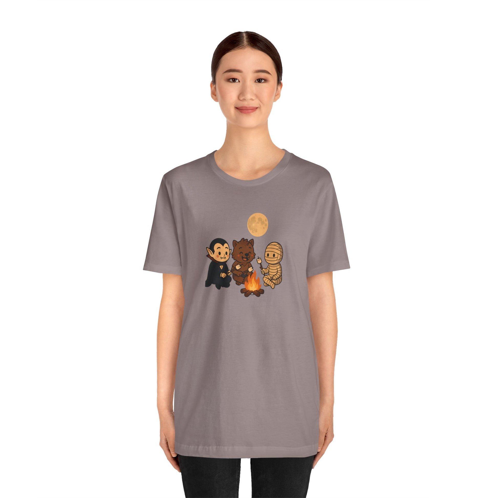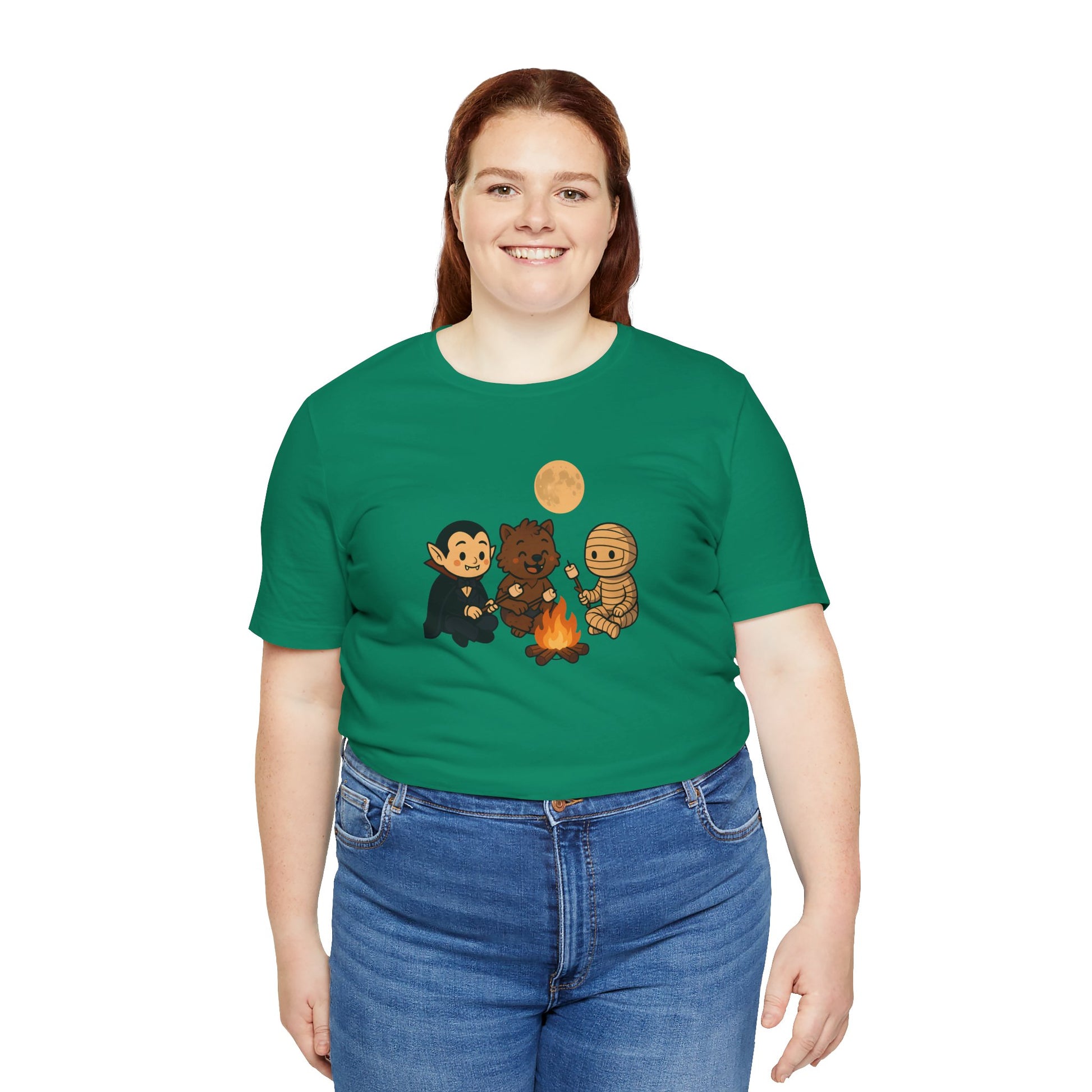 Spooky season just got sweeter. The Halloween Monsters Campfire T-Shirt brings a whimsical twist to classic horror with a charming design of a vampire, werewolf, and mummy gathered around a glowing campfire. Instead of scaring villagers, these monsters are roasting marshmallows under a full moon — because even creatures of the night deserve a cozy night out.