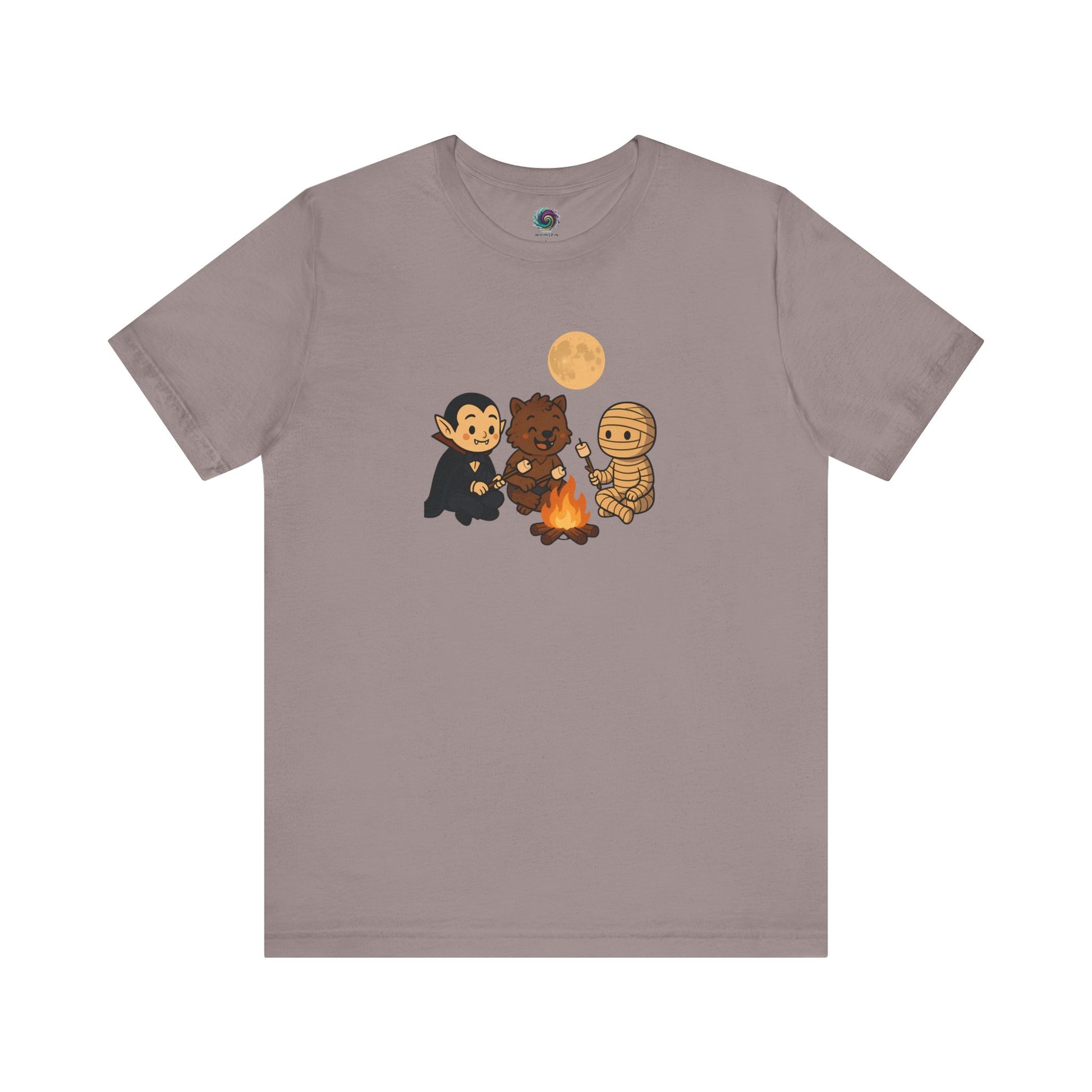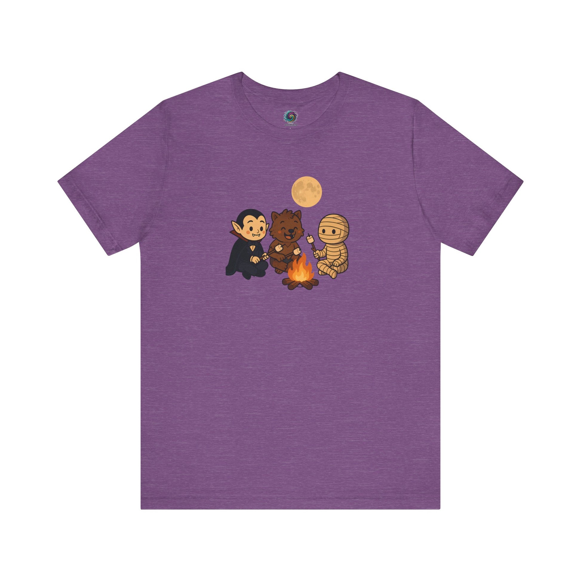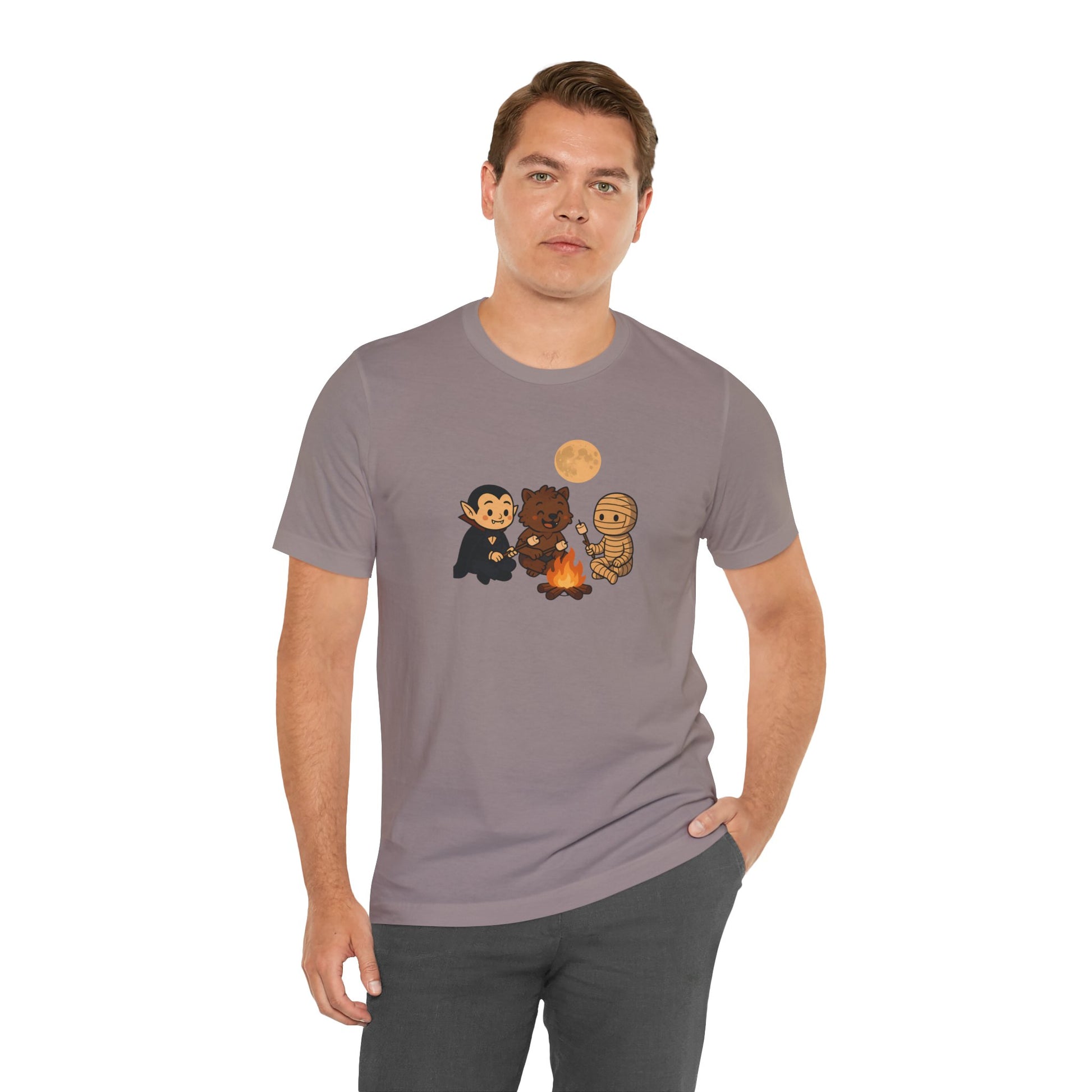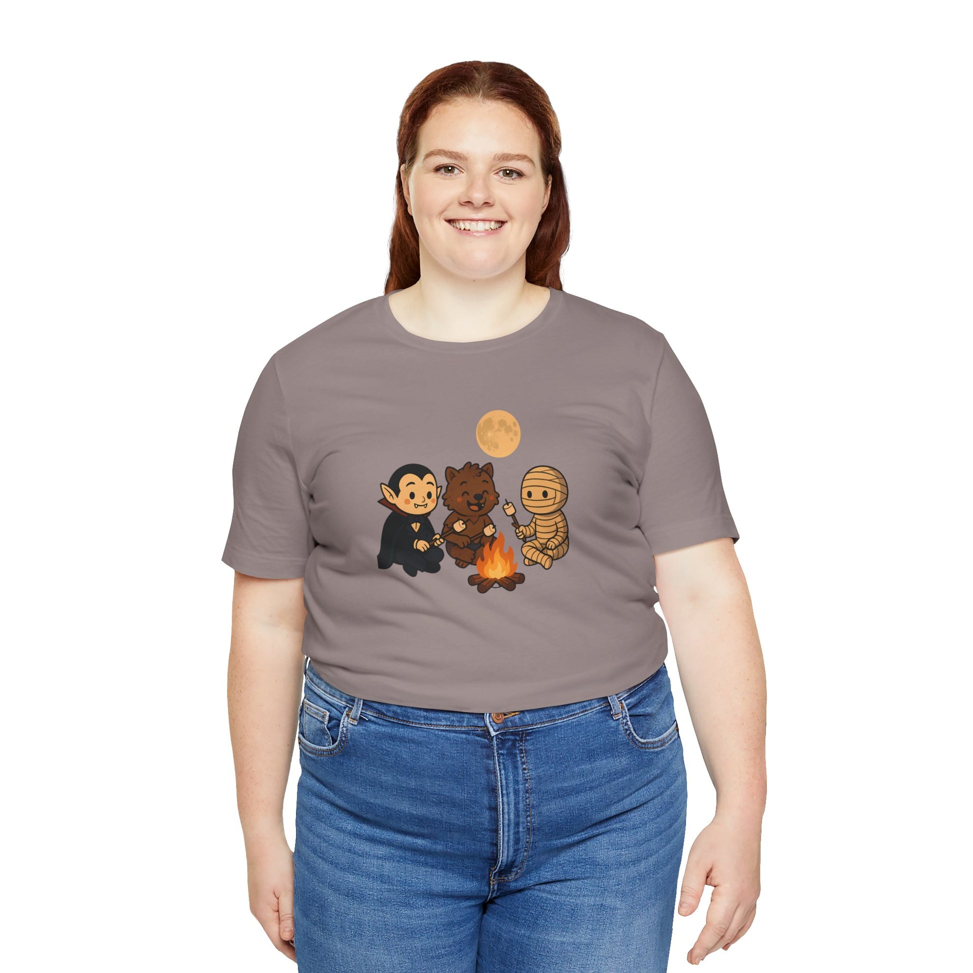 Spooky season just got sweeter. The Halloween Monsters Campfire T-Shirt brings a whimsical twist to classic horror with a charming design of a vampire, werewolf, and mummy gathered around a glowing campfire. Instead of scaring villagers, these monsters are roasting marshmallows under a full moon — because even creatures of the night deserve a cozy night out.