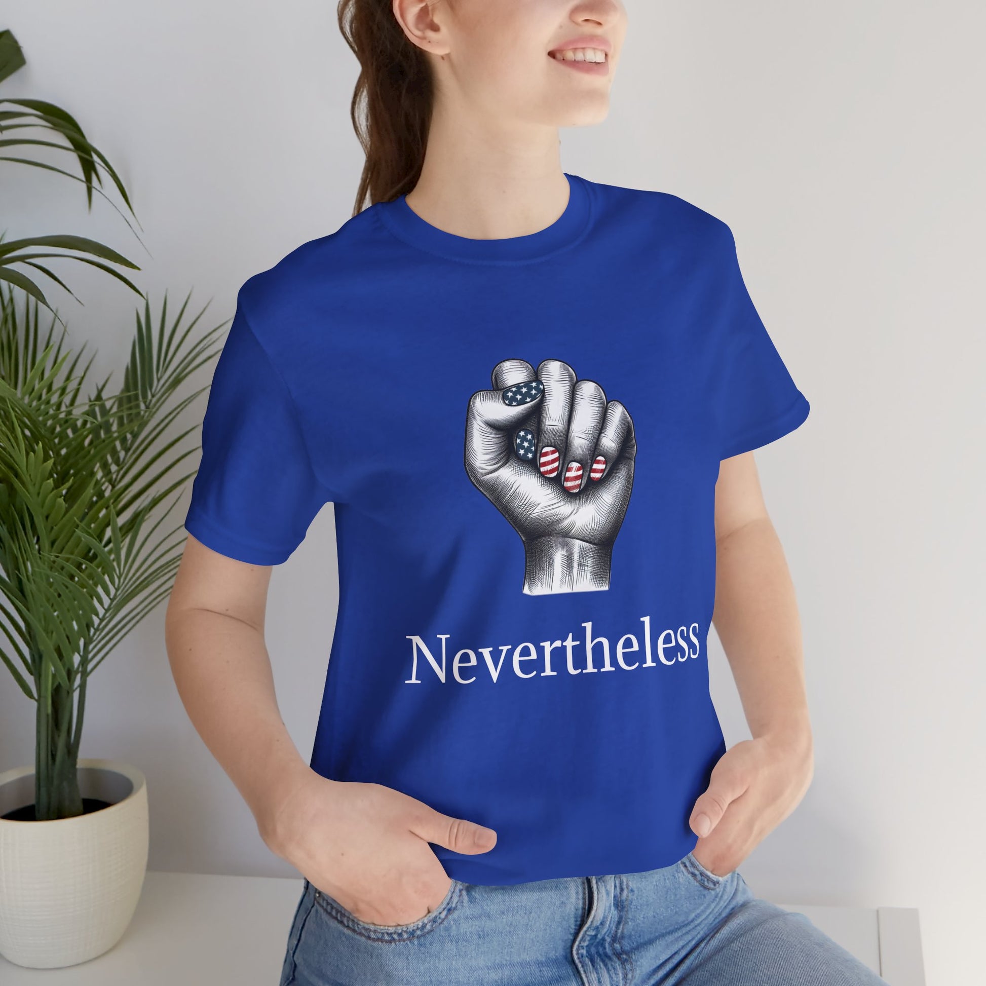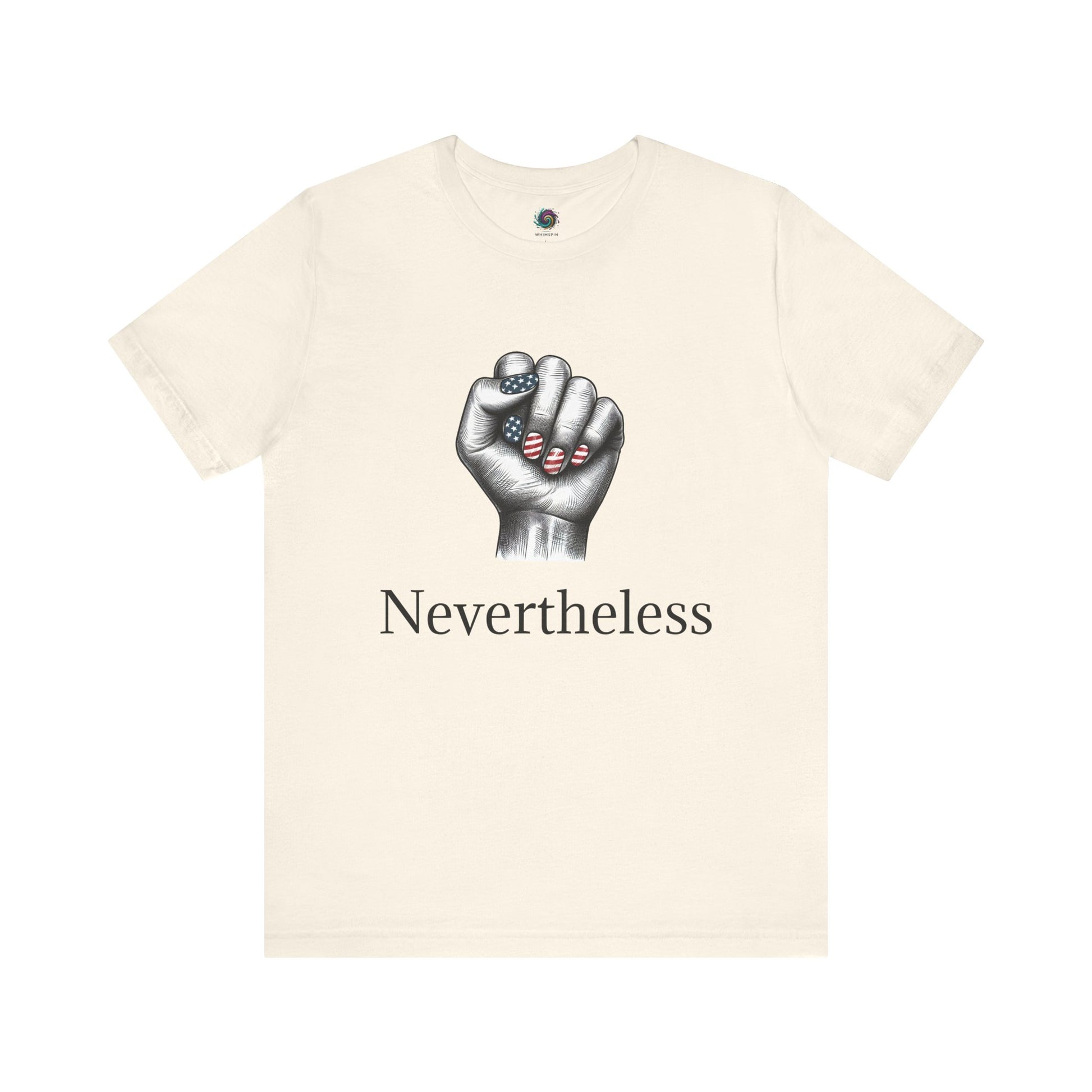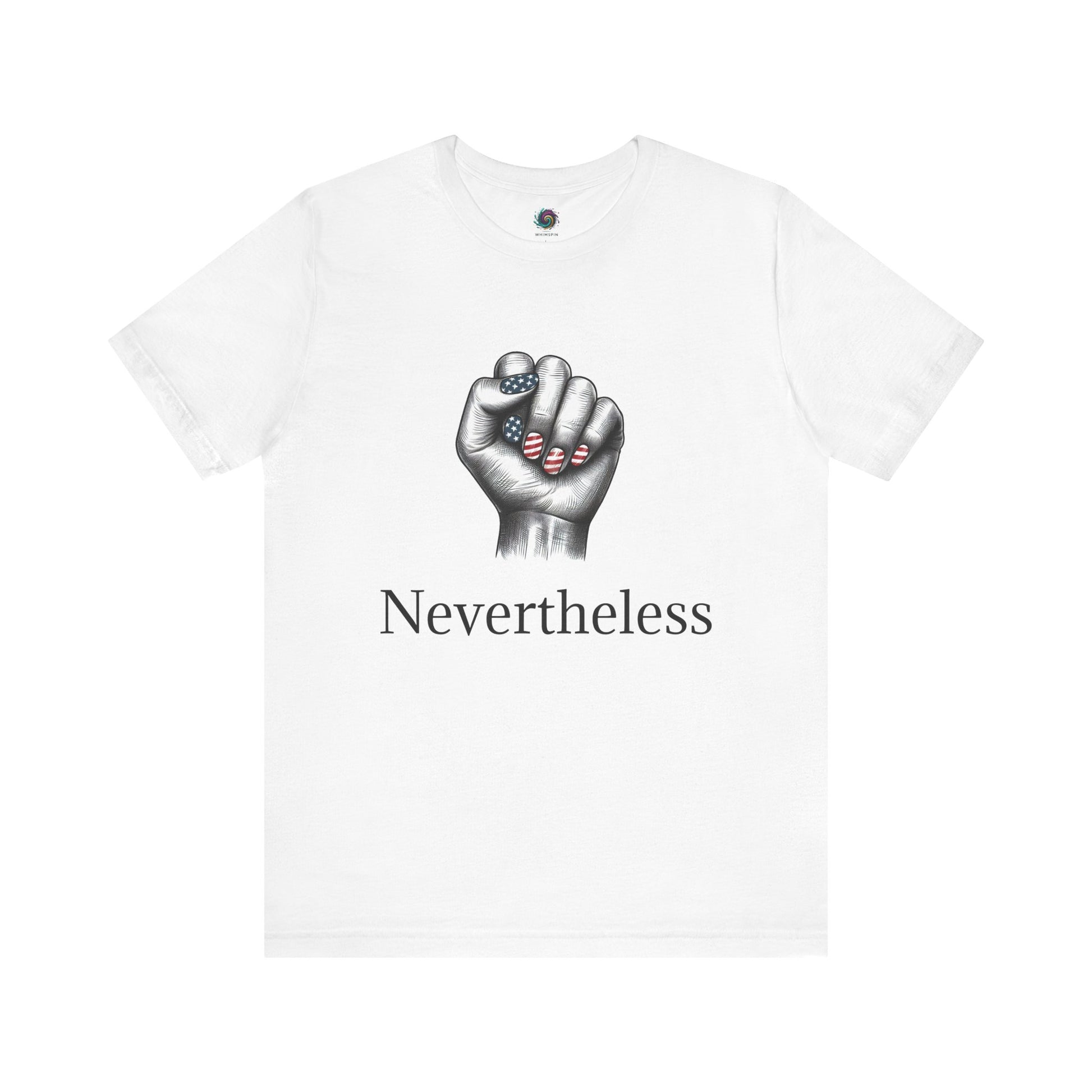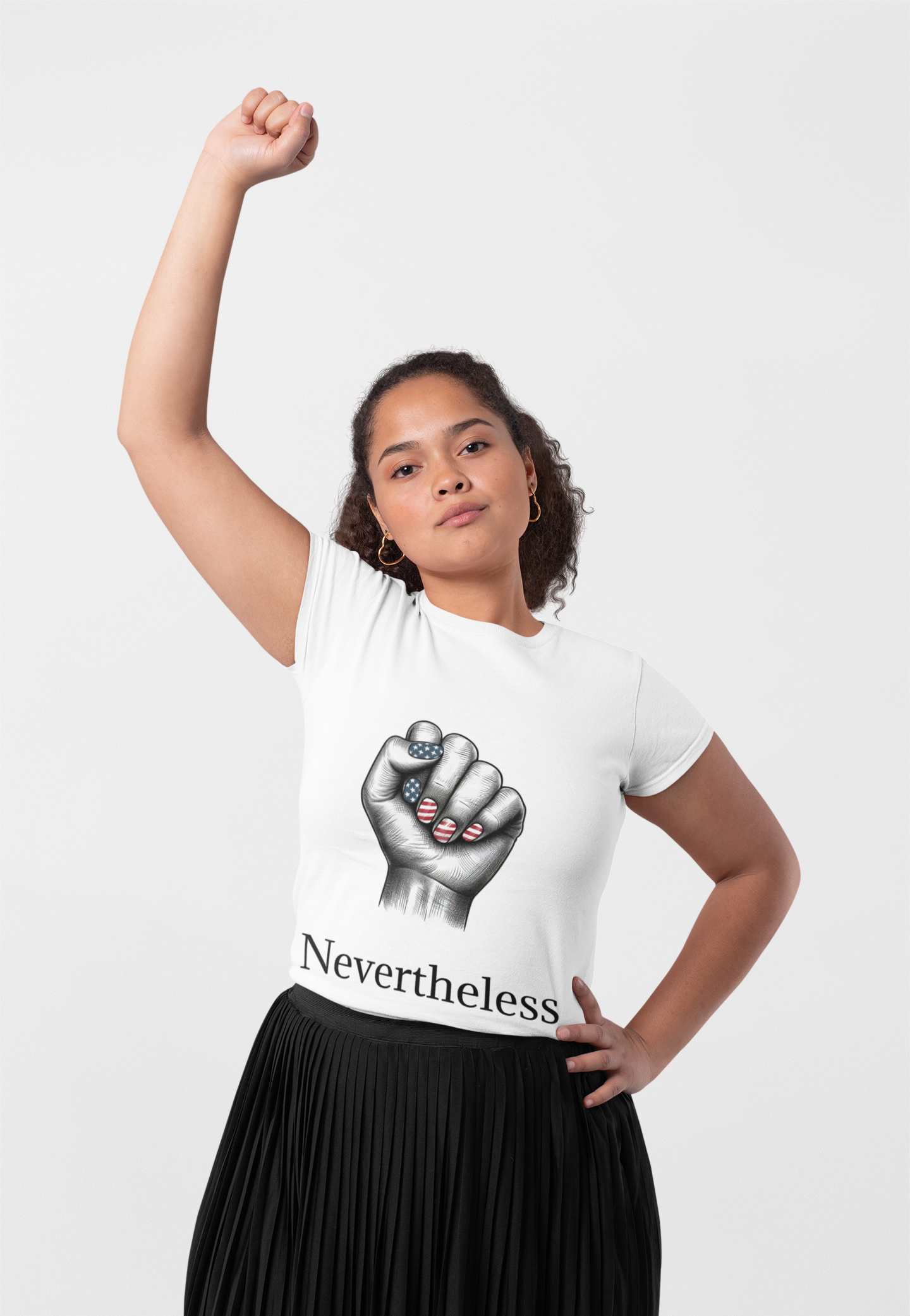 Bold. Patriotic. Unapologetically defiant. This graphic tee says everything without saying a word - except for "Nevertheless," and that's more than enough.