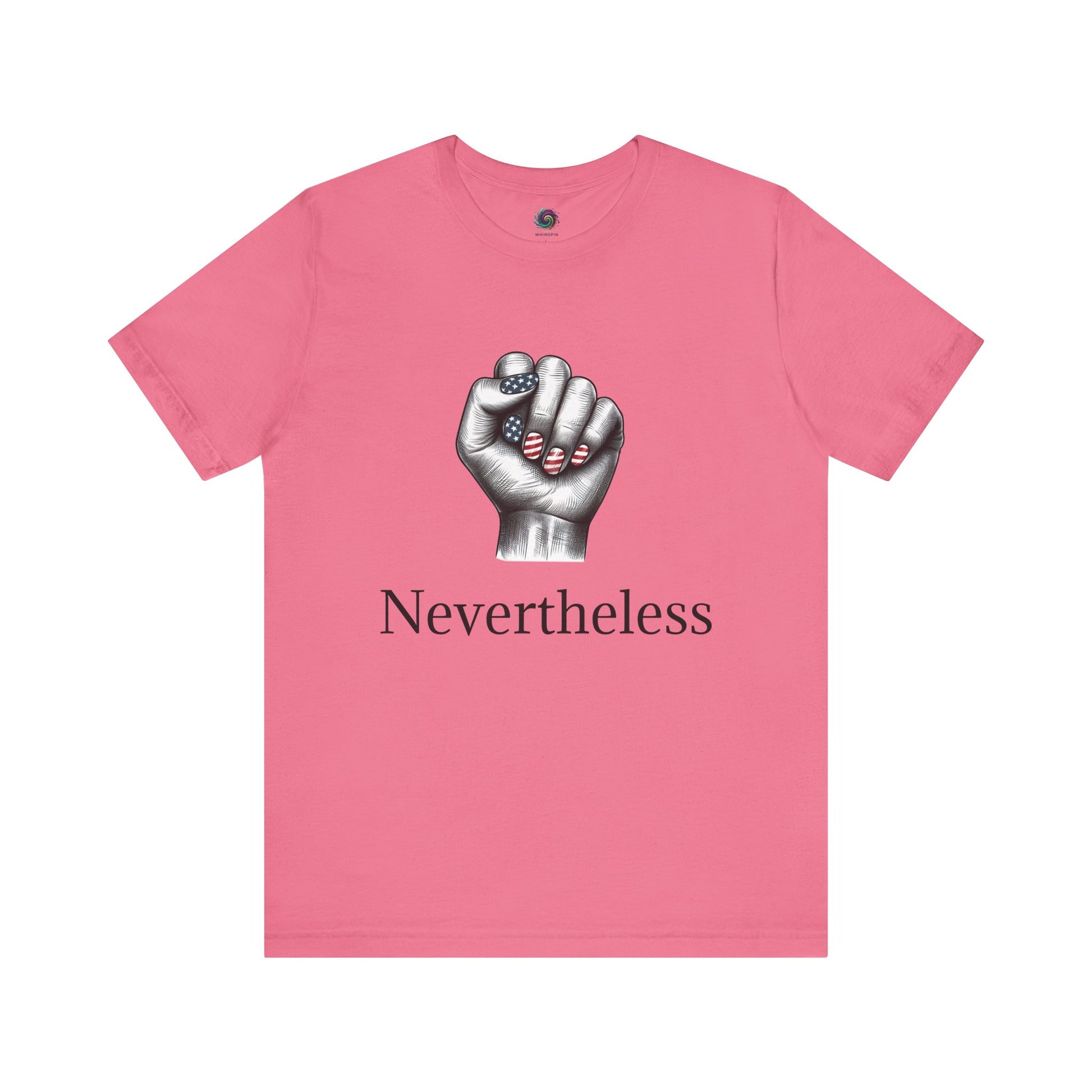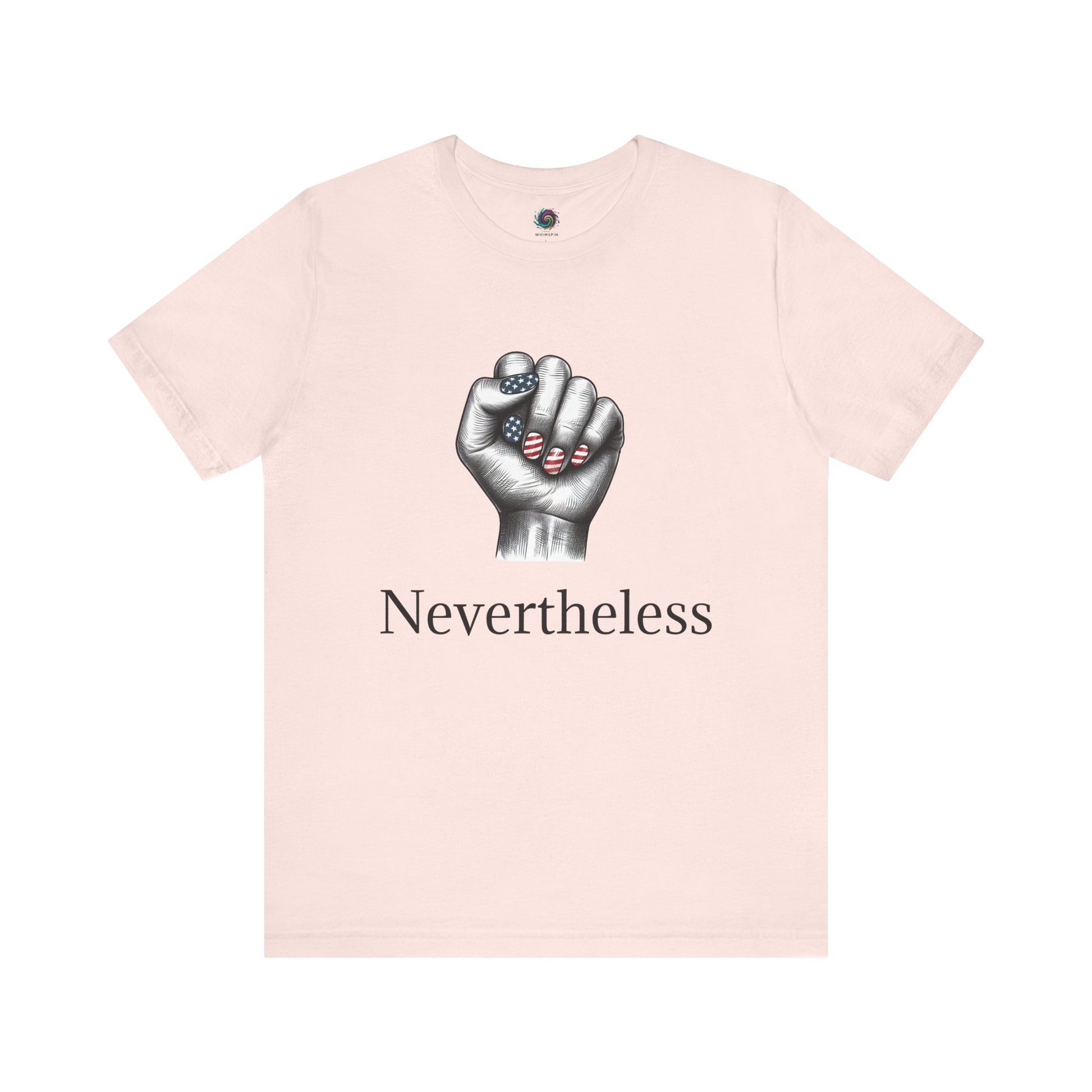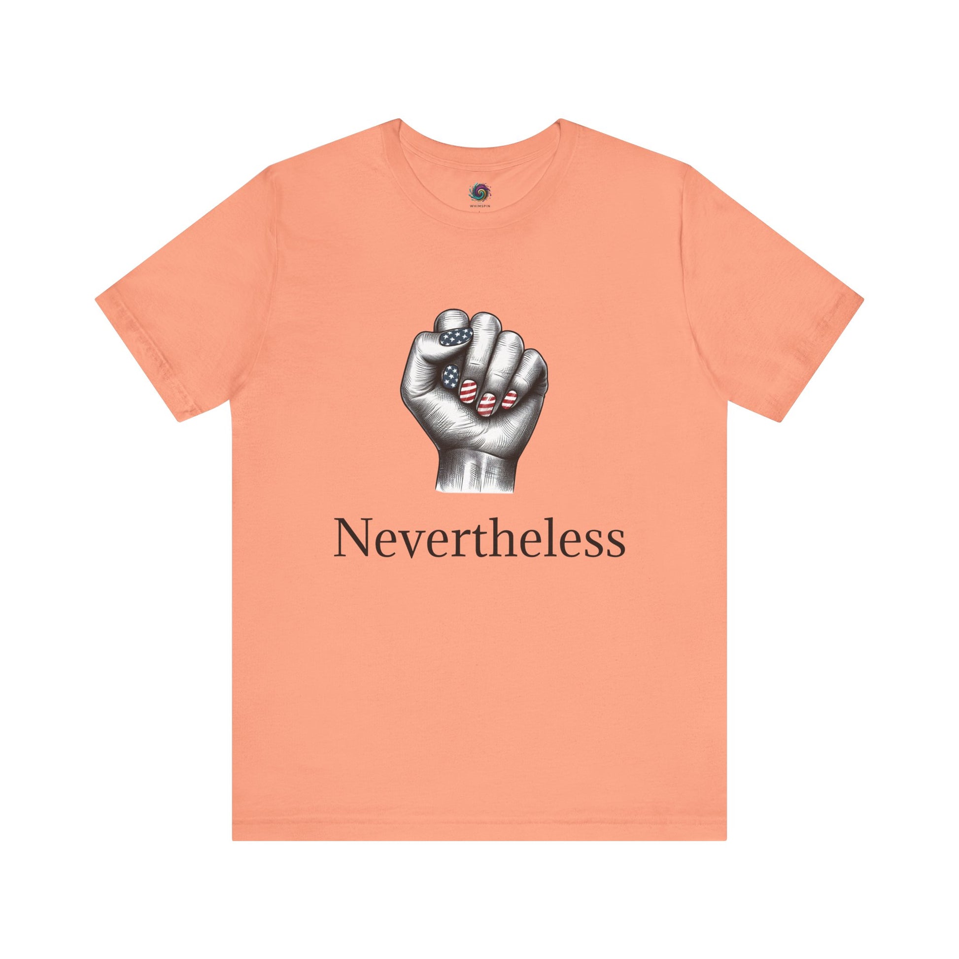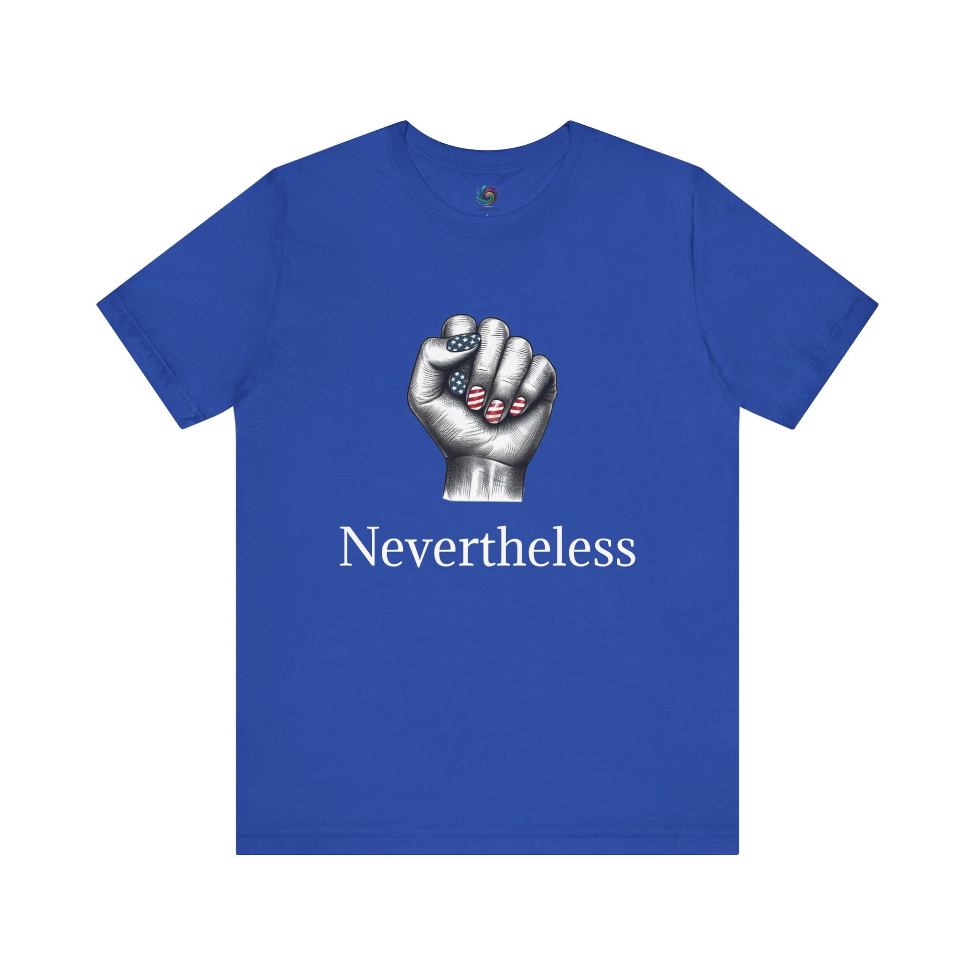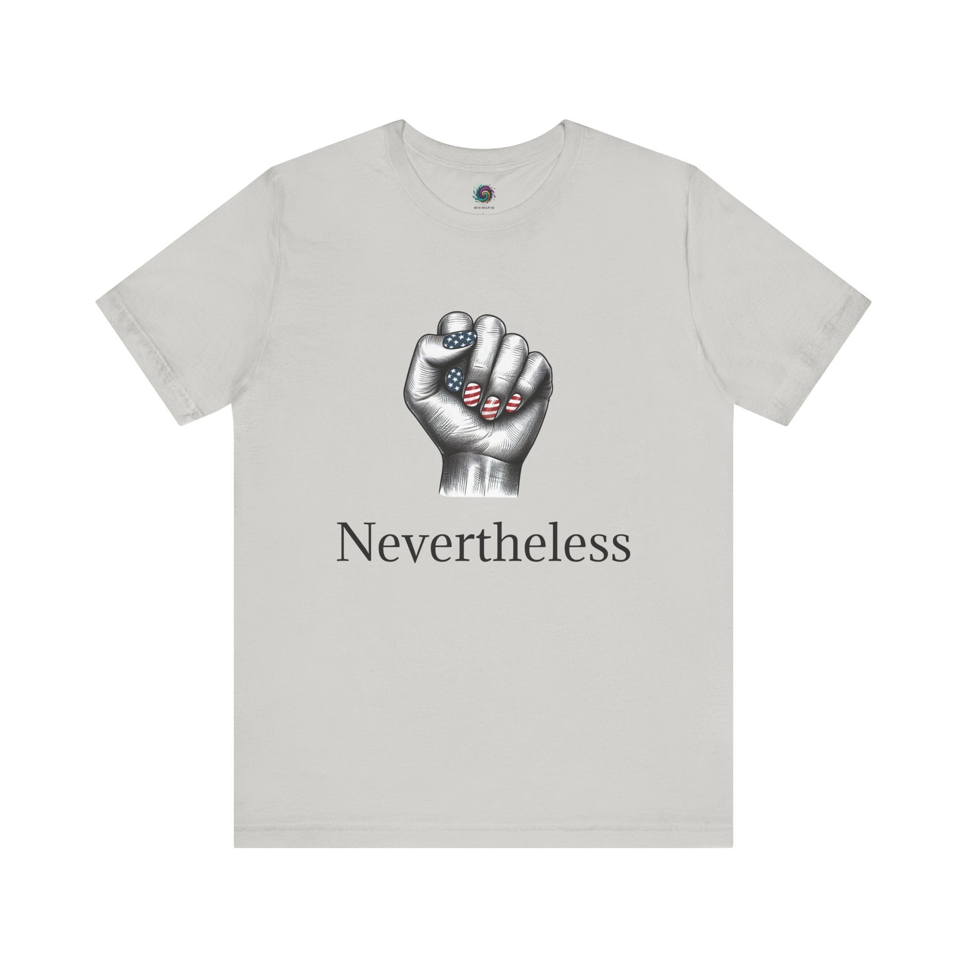 Bold. Patriotic. Unapologetically defiant. This graphic tee says everything without saying a word - except for "Nevertheless," and that's more than enough.