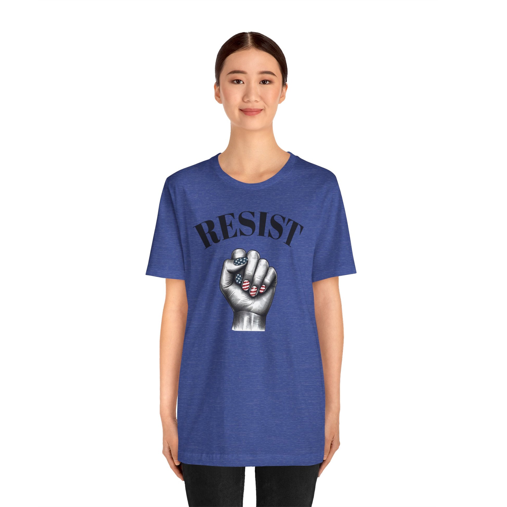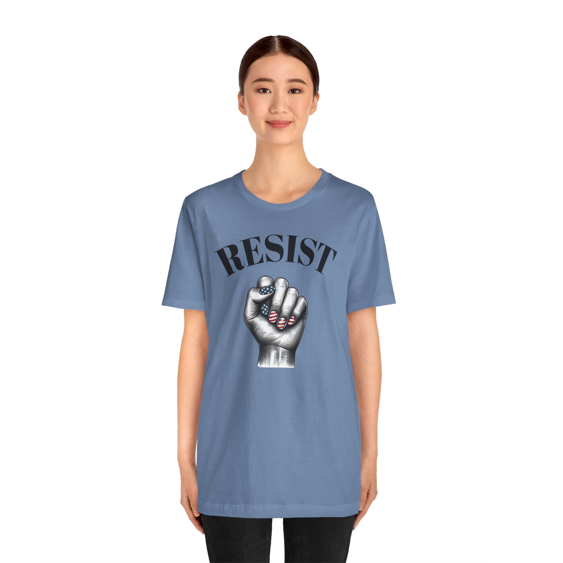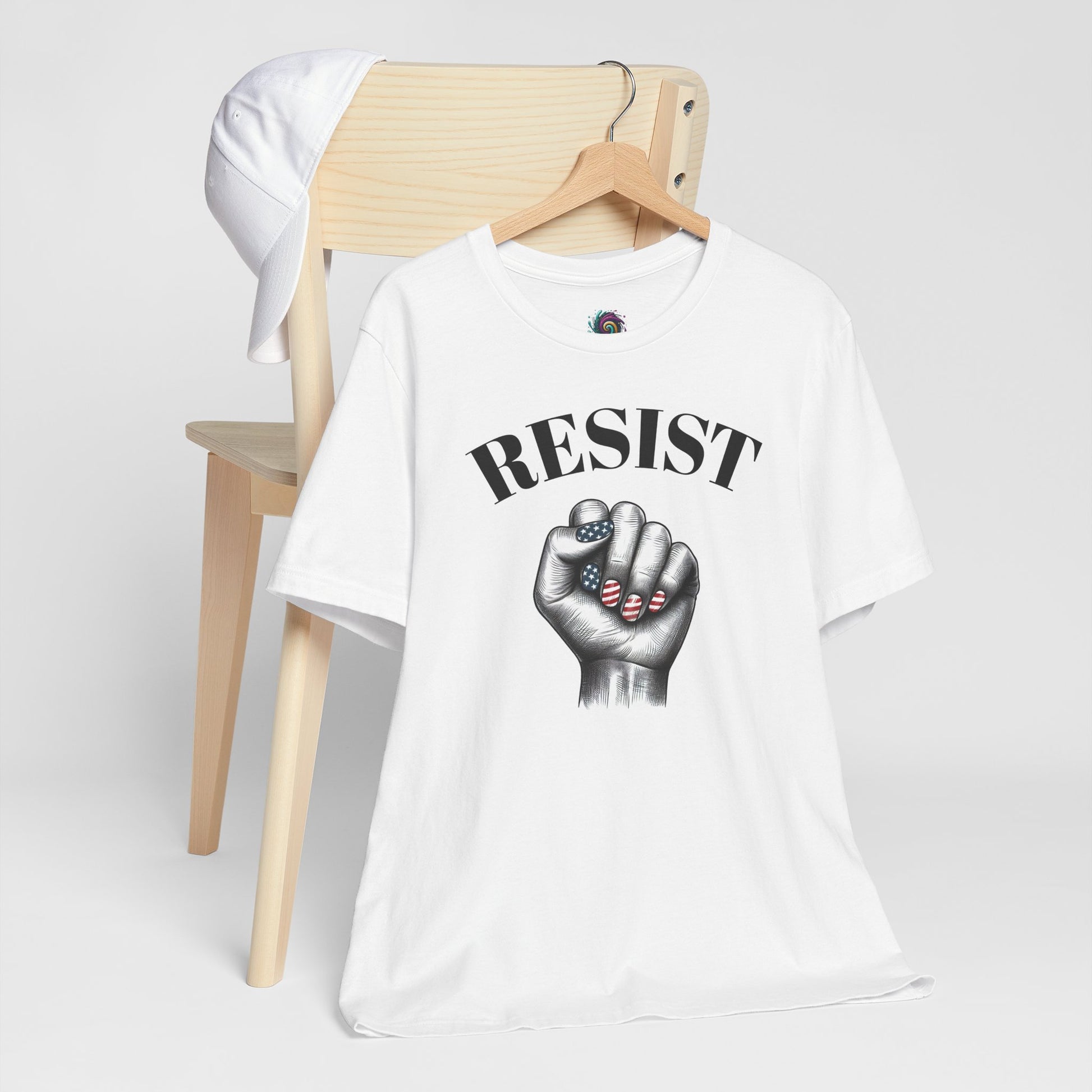 Perfect for marches, voting drives, or simply showing up and standing firm in your values, this feminist graphic t-shirt balances style and strength. The central artwork—a clenched fist detailed in black-and-white linework—is brought to life with pops of red, white, and blue on the nails, a visual symbol of resistance that blends feminism with patriotism. The word "RESIST" arcs above in bold block lettering, anchoring the piece with purpose.