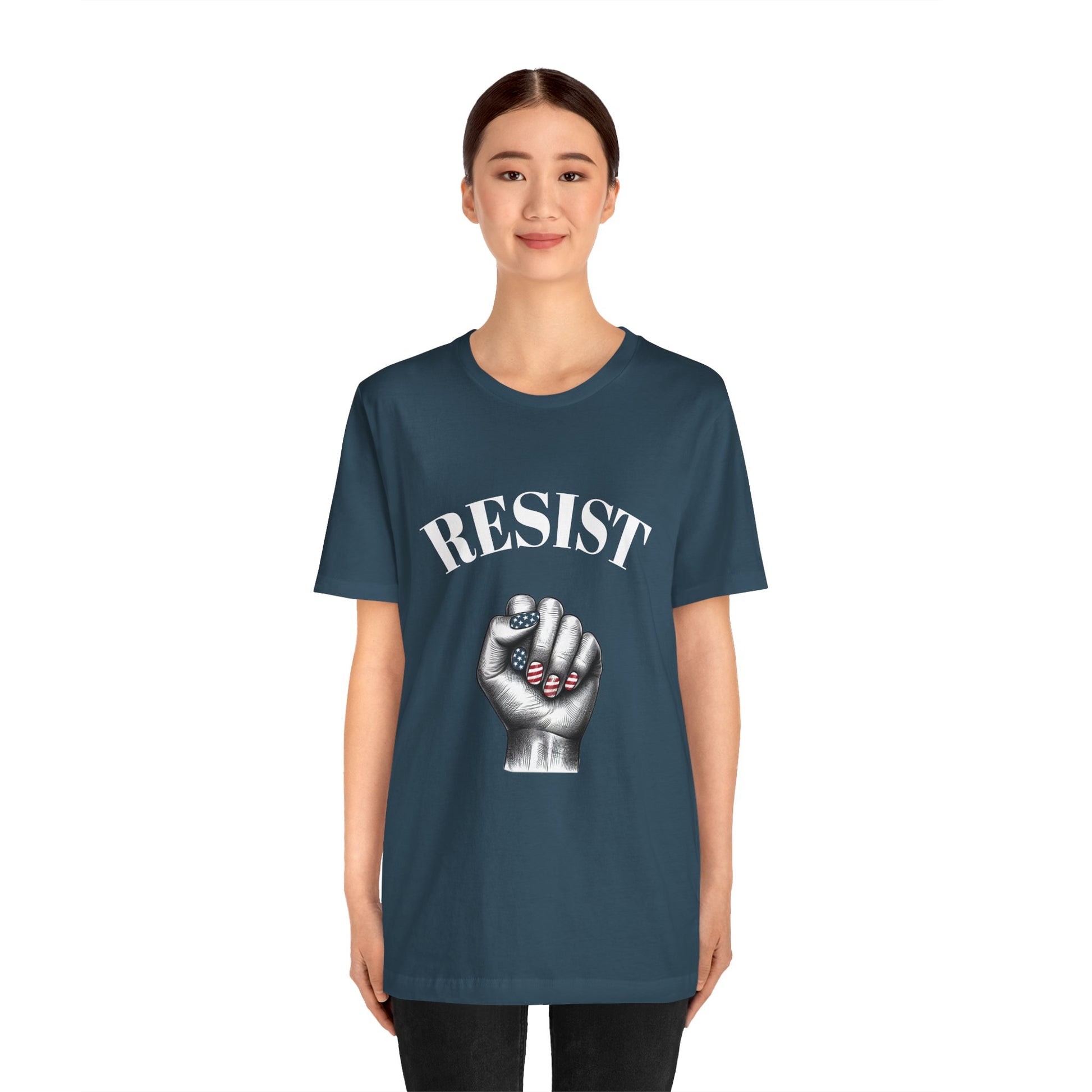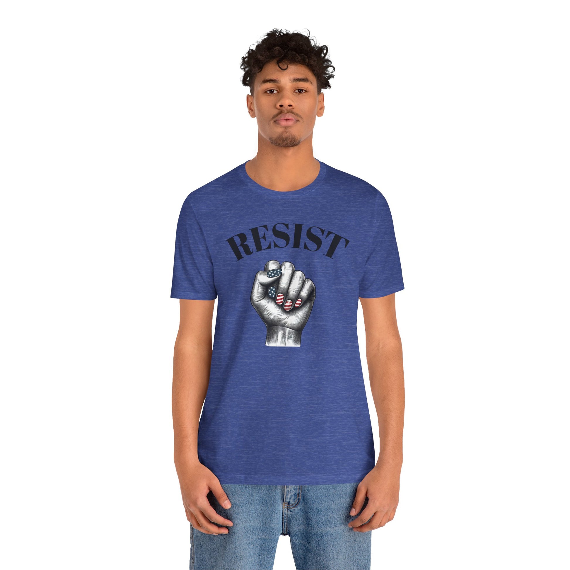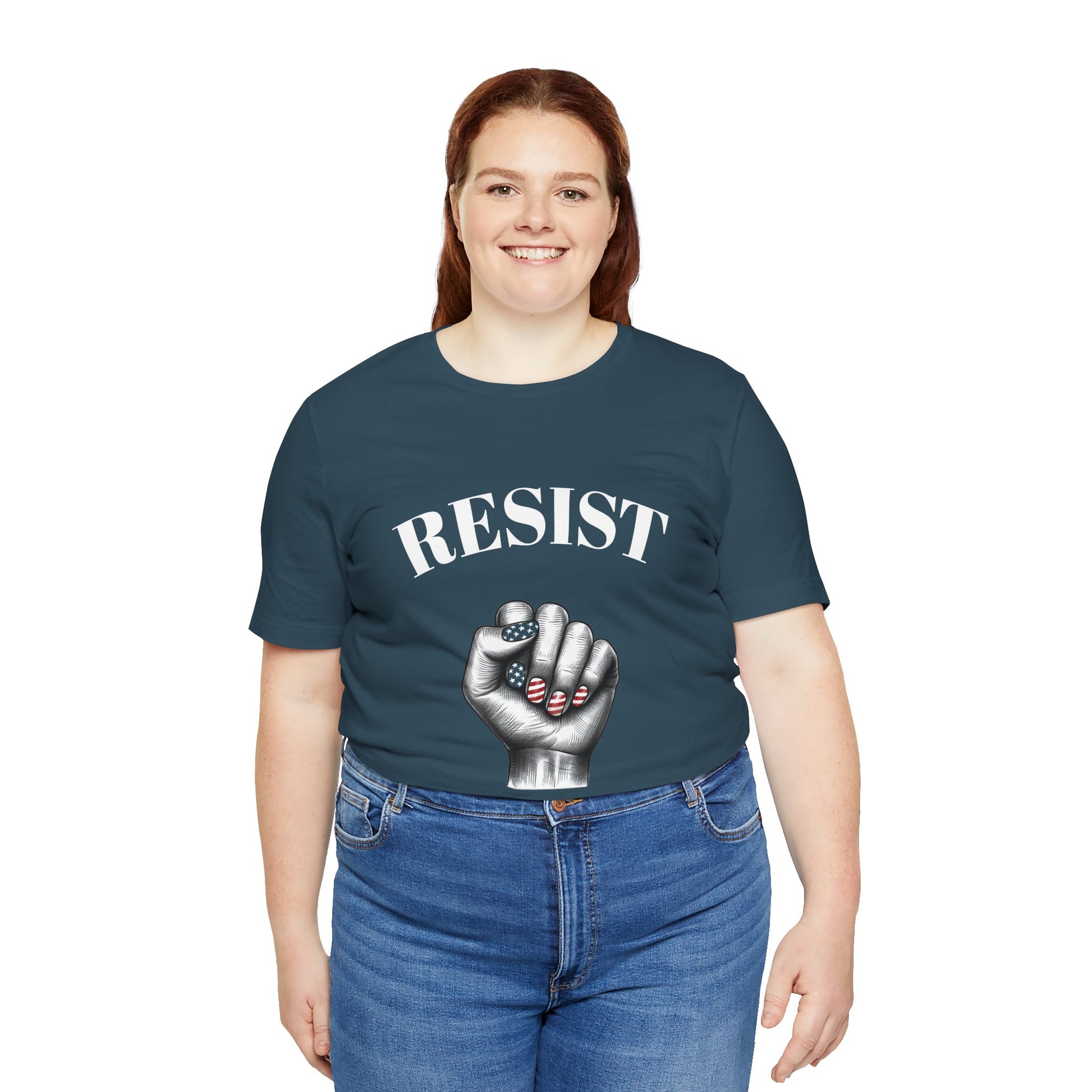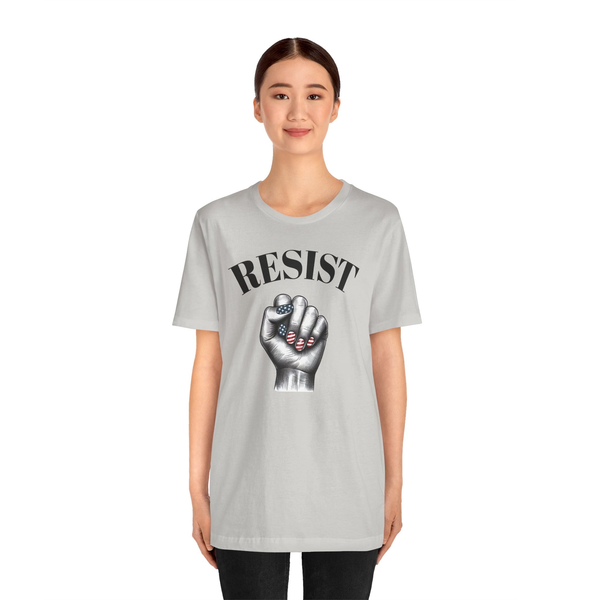 Perfect for marches, voting drives, or simply showing up and standing firm in your values, this feminist graphic t-shirt balances style and strength. The central artwork—a clenched fist detailed in black-and-white linework—is brought to life with pops of red, white, and blue on the nails, a visual symbol of resistance that blends feminism with patriotism. The word "RESIST" arcs above in bold block lettering, anchoring the piece with purpose.