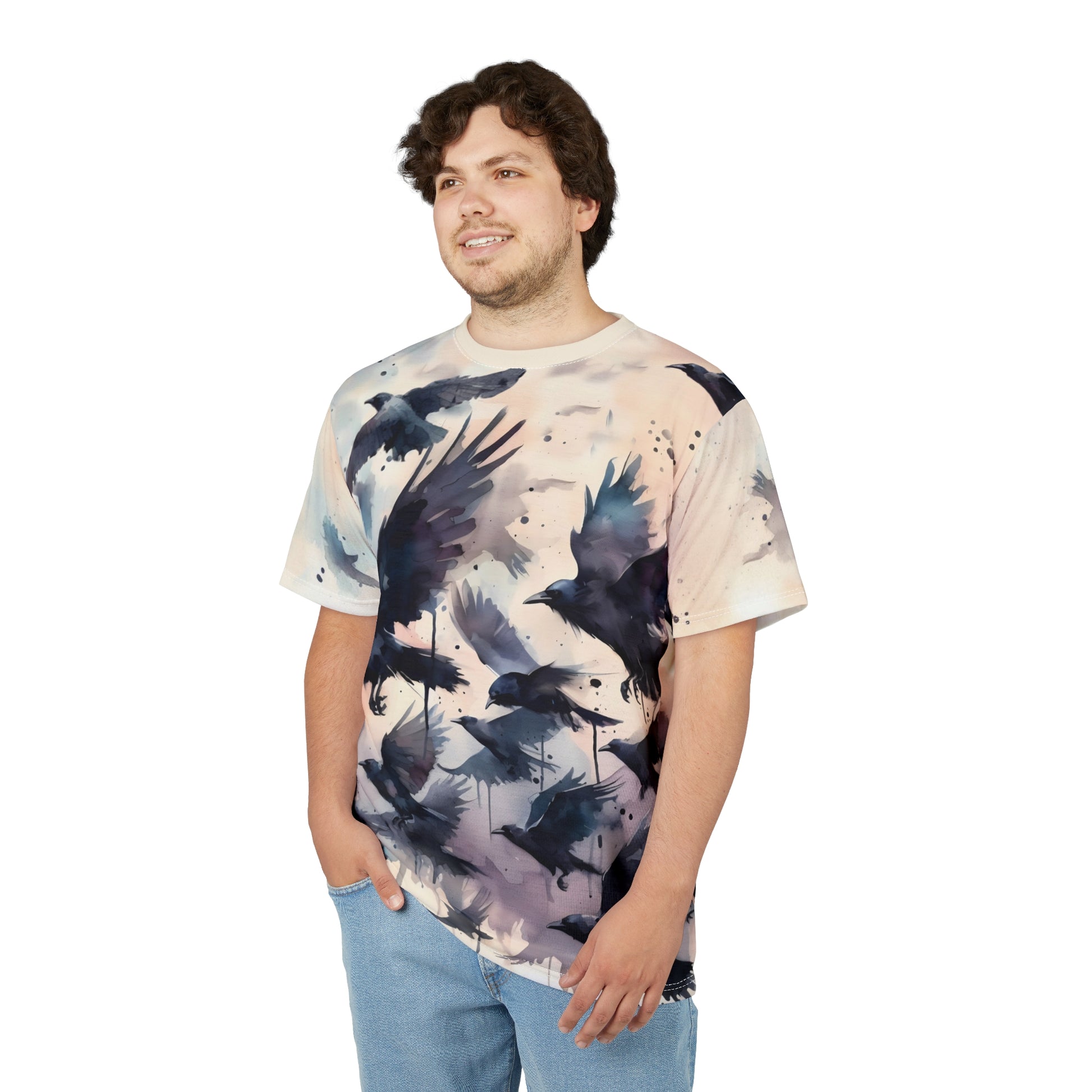 This all-over print tee captures the haunting elegance of crows in flight with a dreamy watercolor technique. Shades of black, grey, and inky violet drift across a soft beige background, giving the design depth and motion — like a swirling sky alive with birds. Perfect for those drawn to gothic aesthetics, dark nature themes, or abstract avian art.