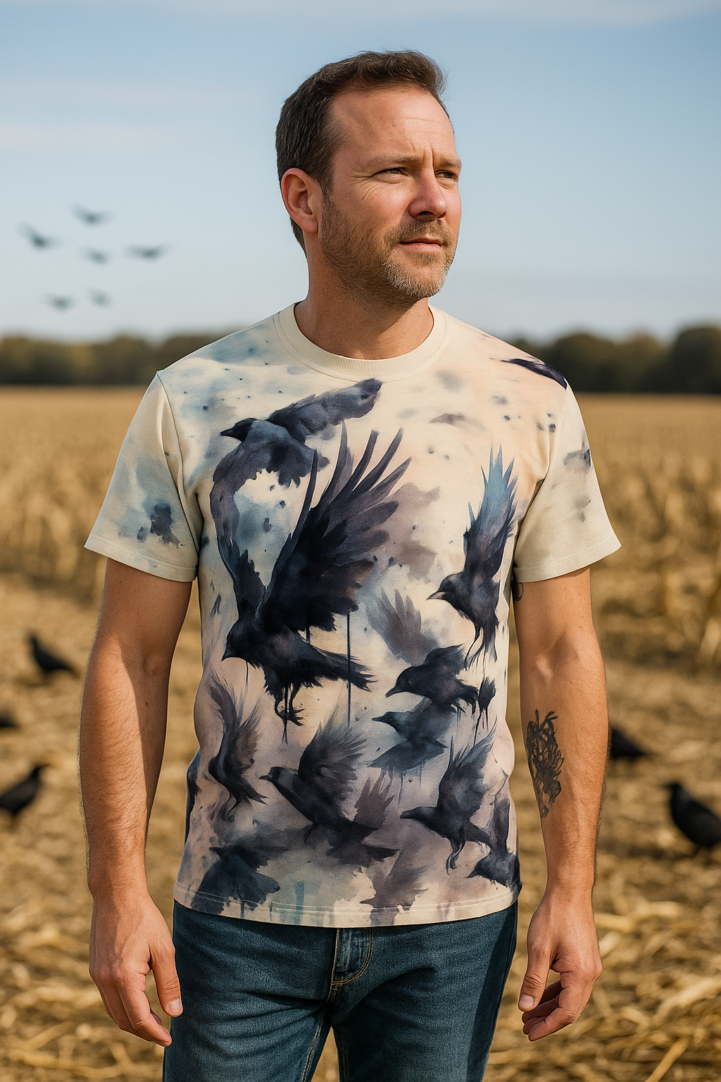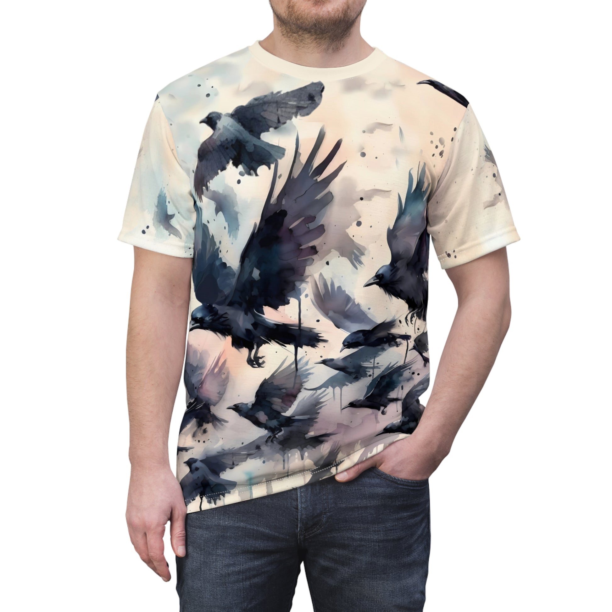 Watercolor Crow Flock T-Shirt – Gothic Raven Flight All-Over Art Tee